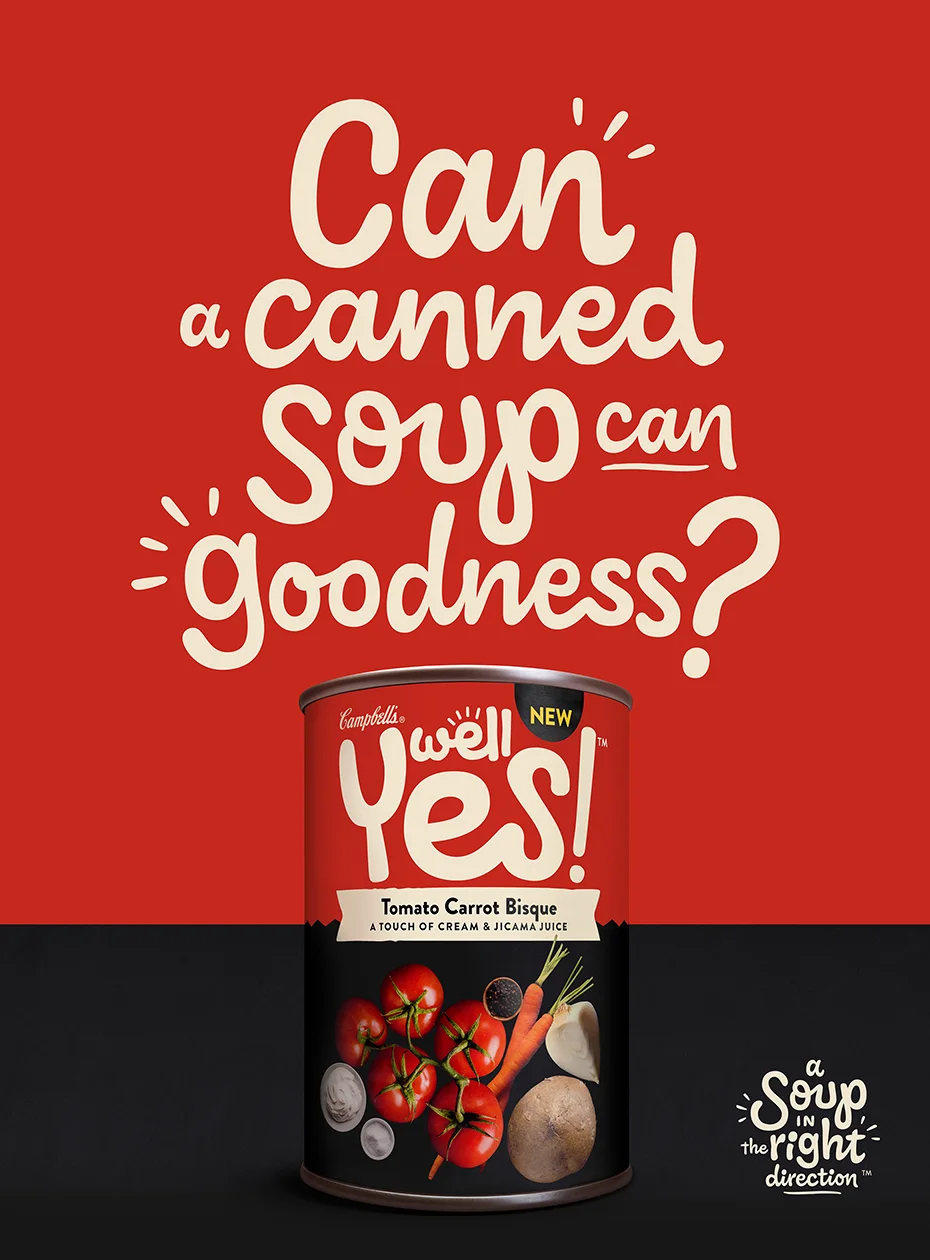 Soup doesn’t have to be, well, just soup. Well Yes! is a new line of soups by Campbell’s. We crafted this fun campaign inspired by their bold packaging design and name.